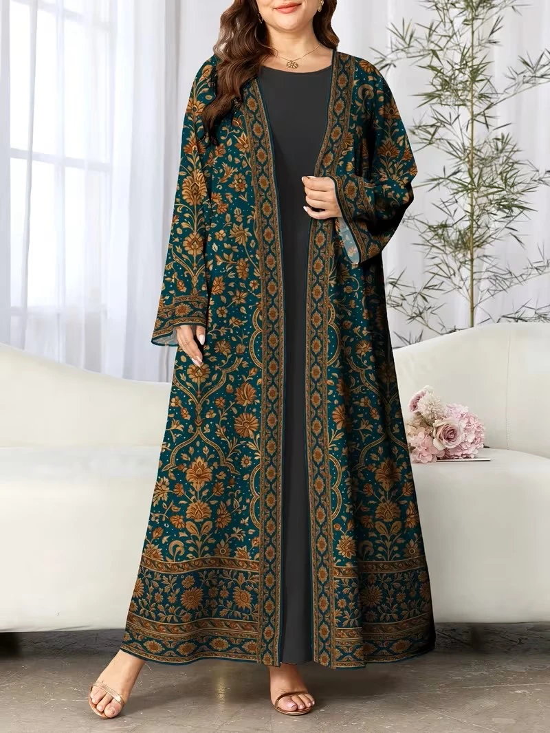 بأكمام طويلة للنساء بمقاس كبير، بطباعة رقمية بنمط أزهار وهندسة، مناسبة للربيع والخريف كعباية عربية كاجوال